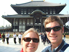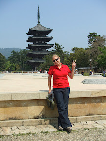 Our first temple, Kofukuji, was right around the corner from lunch so we wasted little time in getting right into the sights. The pagoda here is a rare 5 story pagoda and is the second tallest in Japan, second only to one at the palace in Kyoto. Here's Michelle doing the traditional Japanese photography pose that she has mastered on the trip.