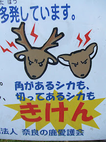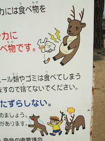 From the first temple to the last and everywhere in between deer are walking around and being fed by tourists who purchase cakes for them from street vendors. All these deer necessitate precautions by the authorities to make sure nothing bad happens, and this leads to some great signage...