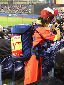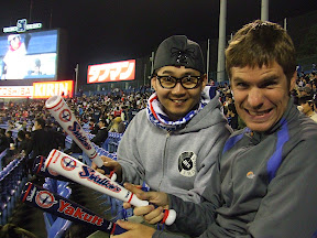 ...we found ourselves on the jumbotron. Michelle happened to be filming on the video camera at the time, but got a bit too excited and forgot her priorities, so we have some great footage of who knows what with all of screaming, "it's all on video" or something to that effect, in the background. In the end we had a blast, and our home town, Yakult Swallows prevailed 2-1, so everyone went home happy.