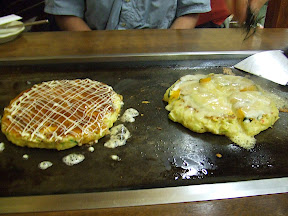 Skipping a proper breakfast to make our train, our first item on the agenda was getting something to eat. We were lucky to stop at a wonderful place, Okaru, for a famous regional dish, Okonomiyaki, a type of Japanese pancake. The restaurant was small and we sat typical Japanese style on mats with our legs tucked underneath. We ordered the house special, a mixture of various seafood, as well as the pumpkin and cheese and it was cooked right in front of us as we watched with great delight.
