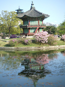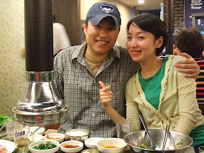 On our first day, Jooyoung took us to Joe's work neighborhood to check out the National Assembly, the river and the tail end of the cherry blossoms. After Joe finished work they quickly immersed us in Korean culture...a Korean BBQ dinner. You cook the meat yourself (we had both pork and beef) and wrap it in lettuce with other toppings. It was delicious! Here's Joe and Jooyoung enjoying their meal...