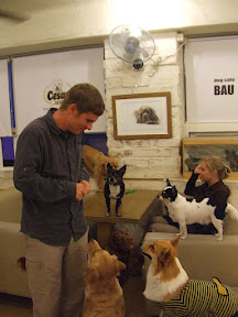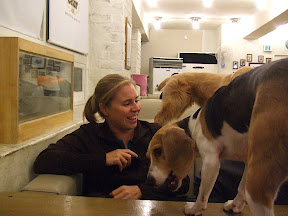 After dinner, Jooyoung headed home and Joe had something special up his sleeve. We walked around his neighborhood which is full of fun bars, restaurants and boutiques. He pointed to a bar at the top of a building and suggested that we check it out. It was called Dog Cafe Bau Haus and we could see dogs' noses pressed against the windows. The dogs are being boarded either daily or long term, and they even have a card with many of the dogs' pictures and names so you can address them by name. The dogs seemed quite well behaved until we purchased some treats for them. They were climbing all over the tables and over us to get the treats. They did know how to sit and shake to get their treats.