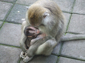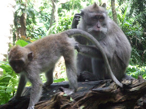 One US dollar equals $8950 rupiah, so we felt like kings after we went to the money exchange and left with almost a million rupiahs. Then we were off to the Sacred Monkey Forest Sanctuary. We didn't buy any bananas to feed the monkeys and encourage them to jump on us, but within 2 minutes one was hugging Evan's leg. There were so many monkeys! Old fat ones, mothers nursing their itty bitty babies, juveniles that were causing trouble (going after the water bottle in Evan's pocket).