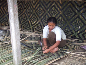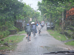 We got on our bikes with storm clouds in the distance. The beginning was all downhill and our hands got more of a workout than our legs. We stopped at a Balinese family's compound and took a look at how they lived. They were making bamboo mats from the bamboo forest in their backyard.